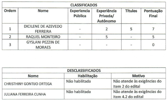 CONSIDERANDO o resultado emitido pela comissão de avaliação após análise dos documentos apresentados pelos candidatos.